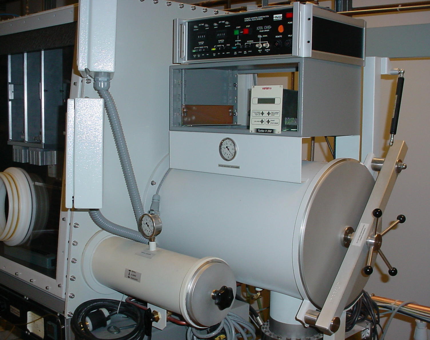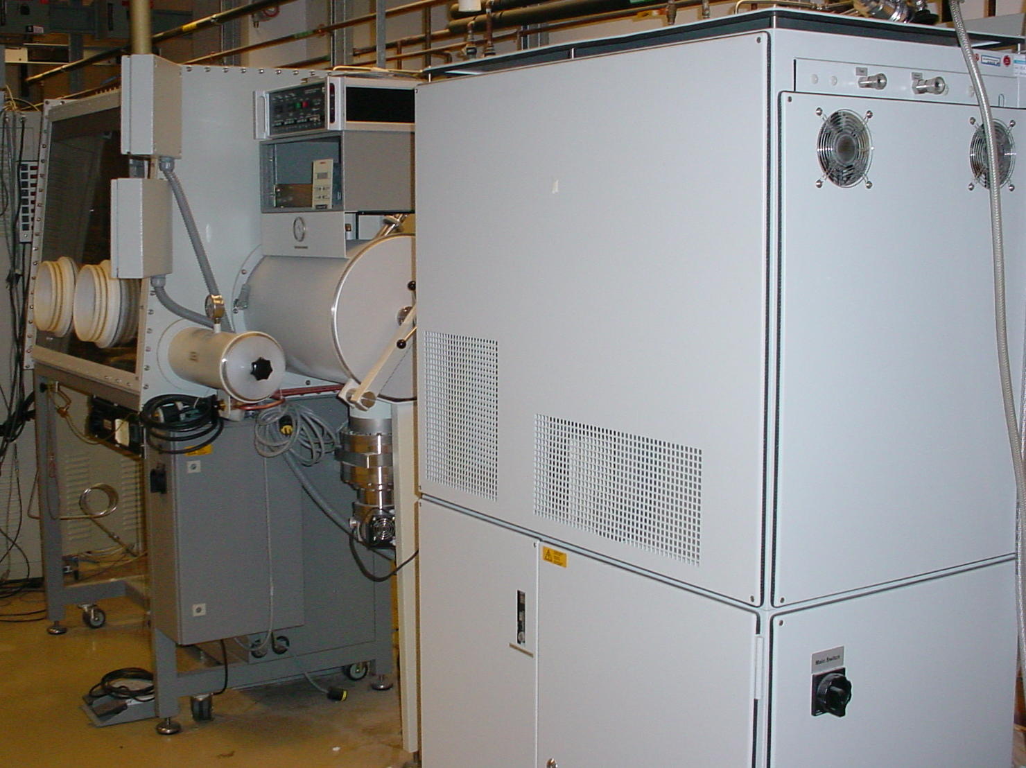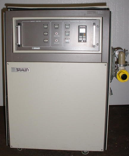 M Braun glove box, Labmaster 130 with Varian TV301 turbo pumped ante chamber and separate nitrogen gas purifier MB-200G-W-N-I. Includes MB-OX-SE1 and MB-MO-SE1 oxygen and water sensors. The main box was made in 1996 and retrofitted in 2002 with the high vacuum antechamber. The N2 purifier was made in 2004 |