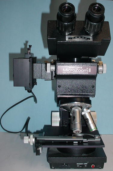 Bausch & Lomb MicroZoom II long working distance microscope mounted on R stand. 10x eyepieces and 2.25, 8 & 25 power objectives. Secondary focusing block can be removed to center objectives over the stage. Reflected light only 115 volts 50/60 28# |
