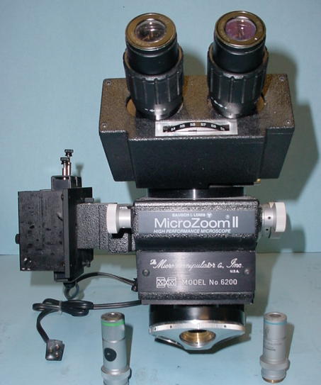 Bausch & Lomb Microzoom II microscope with mount for Micromanipulator 6200. With 10 power eyepieces and 2.25 & 8 power objectives |