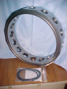 17″ ID x 20″ OD x 4-5/16″ tall NRC 1505 stainless steel feedthrough collar with sixteen 2 ¼” ID feedthrough holes without blank offs