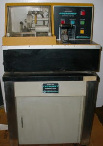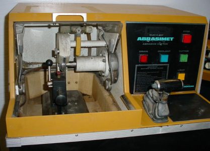Buehler Abrasimet 9″ saw, 10-1050-260 with cabinet and coolant system. Left hand vise