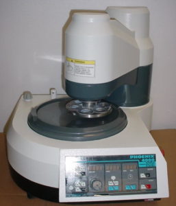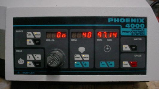 Buehler Phoenix 4000V 49-4101-260 12″ automatic polisher with single force, 1.25″ specimen holder. Accepts central force holders as well. 50 to 600 rpm 230/60/50/3 power input. With one 12″ aluminum platen