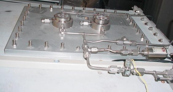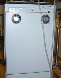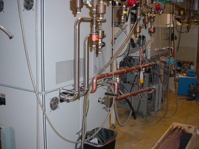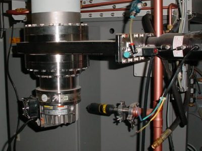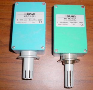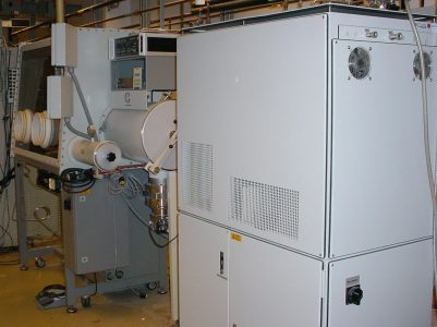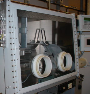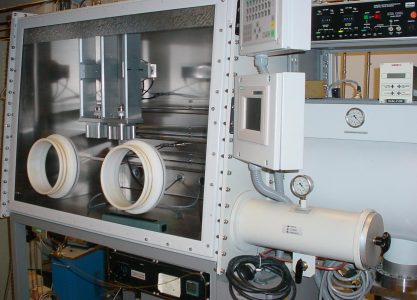 M Braun glove box, Labmaster 130 with Varian TV301 turbo pumped ante chamber and separate nitrogen gas purifier MB-200G-W-N-I. Includes MB-OX-SE1 and MB-MO-SE1 oxygen and water sensors. The main box was made in 1996 and retrofitted in 2002 with the high vacuum antechamber. The N2 purifier was made in 2004