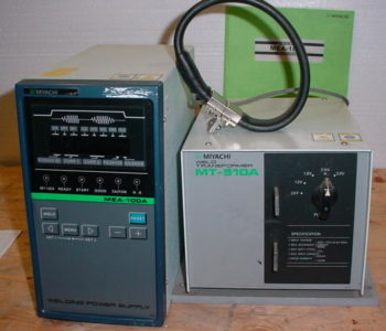 Miyachi MEA-100A AC welding controller, two pulse capability, with MT-510A transformer, 1 KVA, 1600 amps and current feedback toroid. Higher capacity transformers available. 200-220 volts, single phase.