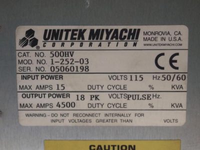 Unitek Miyachi 500HV 1-252-03 500 watt second supply, dual pulse, with external pulse transformer (78#). Higher output voltage than 500DP: 14.6 to 19 volt into a .004 ohm load