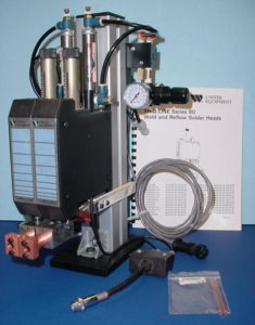Unitek Miyachi Thinline 88A/24 2-160-05-01 air operated series head, 1/4″ eccentric electrodes. Ideal for battery tabbing. 20# force, 24v solenoid. 2 KVA/250 wt-sec rating. 18# net weight.