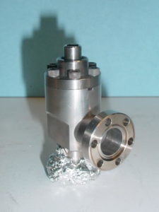Varian 951-5014 1-1/3″ CF right angle manual MiniFlat, uses gold & copper seals, no longer available from Varian. Bellows tested, not rebuilt, 8 available